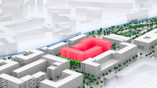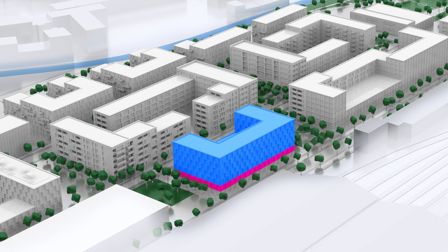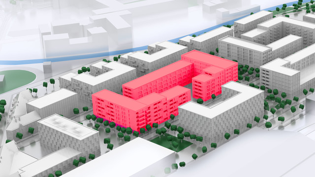 Baufeld 6 hat eine Gebäudehöhe von sechs Geschossen und bietet in erster Linie Mietwohnraum. In besonders behüteter Lage innerhalb des Quartiers, an der Südseite des Grundstücks, ist auf zwei Etagen die Kita mit 90 Plätzen eingeplant. Die A …